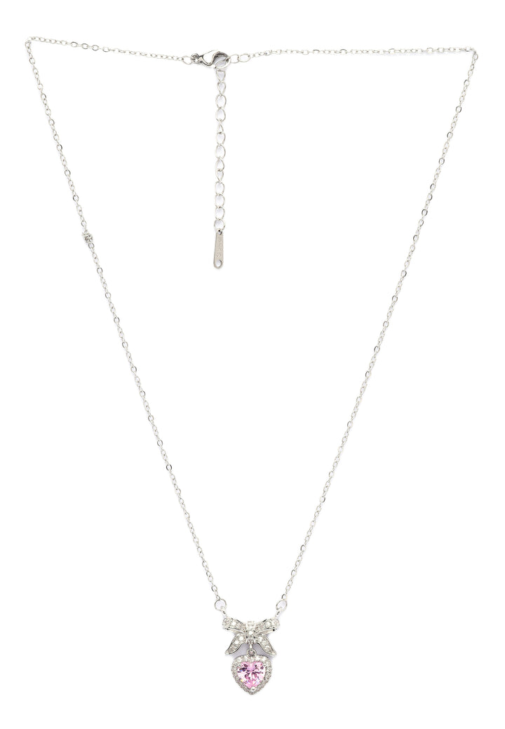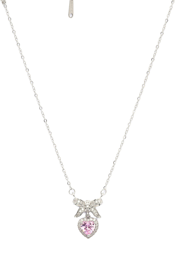 Tilføj et strejf af charme og sofistikering til dit look med denne fortryllende halskæde. Den har en delikat sløjfe prydet med glitrende sten, og den holder en fantastisk hjerteformet pink ædelsten, der udstråler elegance. Den fine sølvkæde fremhæver dets yndefulde design, hvilket gør det perfekt til både hverdagsbrug og særlige lejligheder. Dette halskæde er den ultimative blanding af sødme og stil, bestemt til at blive et værdsat stykke i din samling.