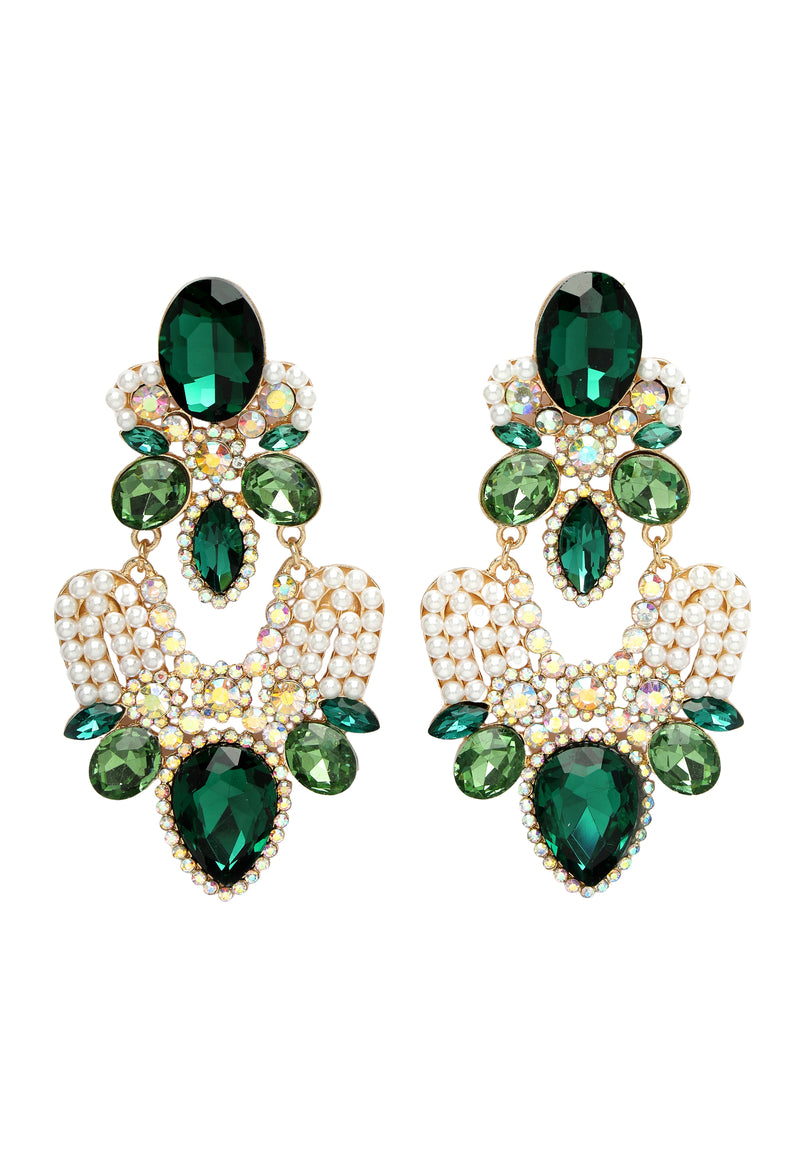 Des cristaux scintillants forment des formes délicates en feuille qui se courbent et se déversent, accentués par de petites pierres vert vif. Le design culmine en un pendentif en forme...