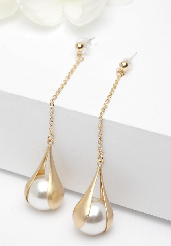 Un alone circolare incrostato di cristalli pende sopra una perla a forma di pera luminosa. Il contrasto tra i cristalli scintillanti e il morbido bagliore della perla crea un design...