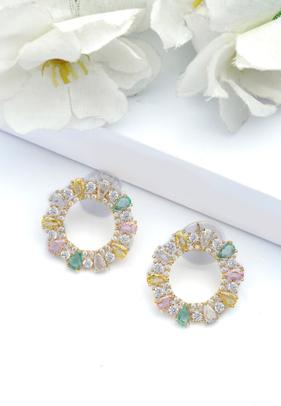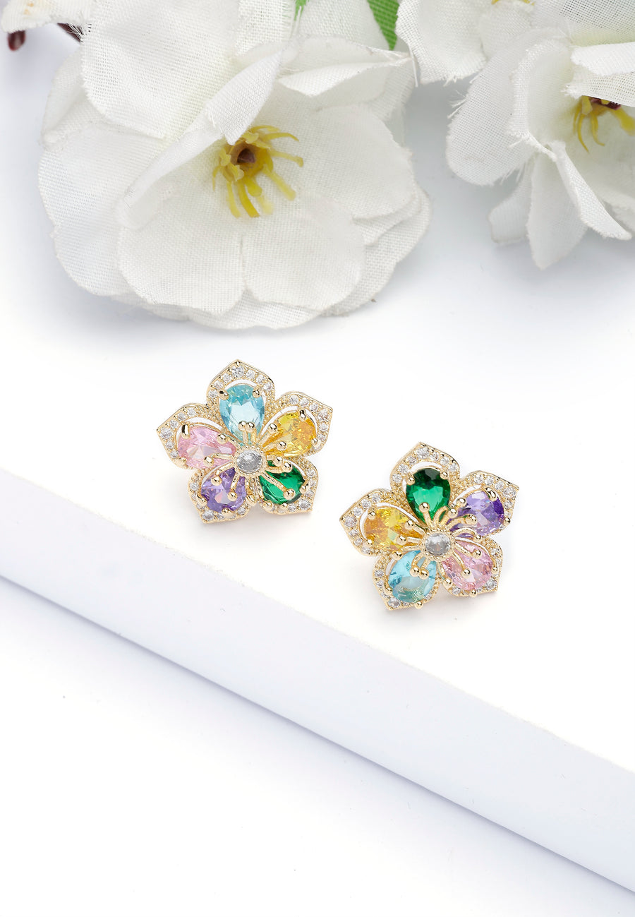 Te żywe, kwiatowe kolczyki w kształcie kropli mają kolorowy zestaw płatków przypominających kamienie szlachetne, otaczających centralny czerwony kamień, zawieszone w złotym wykończeniu z błyszczącymi akcentami. Rozmiar : S : 2.6...