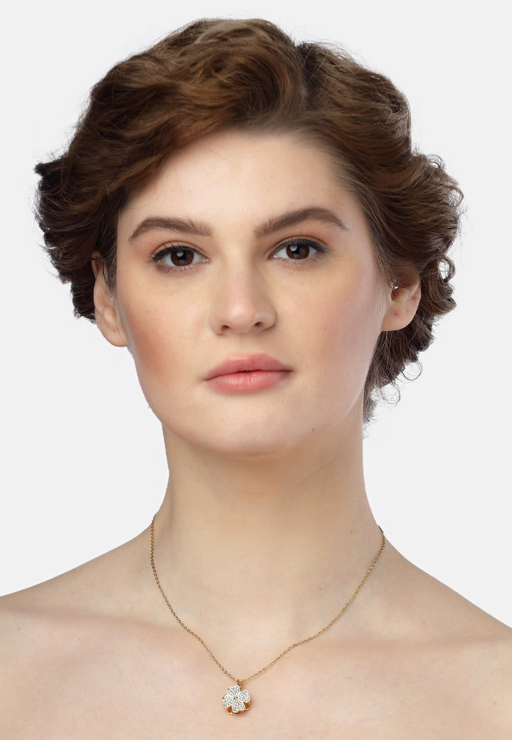 Dette halskæde har en charmerende firkløver vedhæng, besat med glitrende sten, der funkler ved hver bevægelse. Vedhænget hviler på en delikat kæde, hvilket gør det til det perfekte hverdagstilbehør, der tilføjer et strejf af held og glans til dit look.