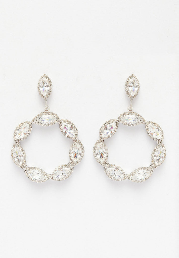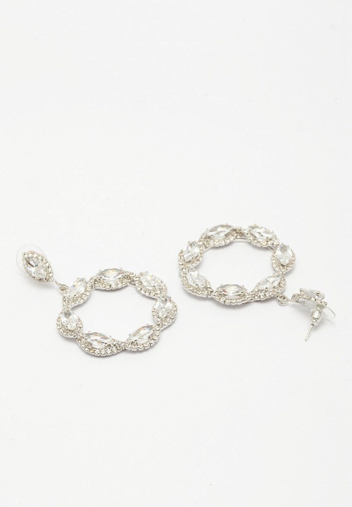 Crystal round earrings with rhodium plating. The style for a soiree with a silver dress or with puffed shoulders for an elegant look.