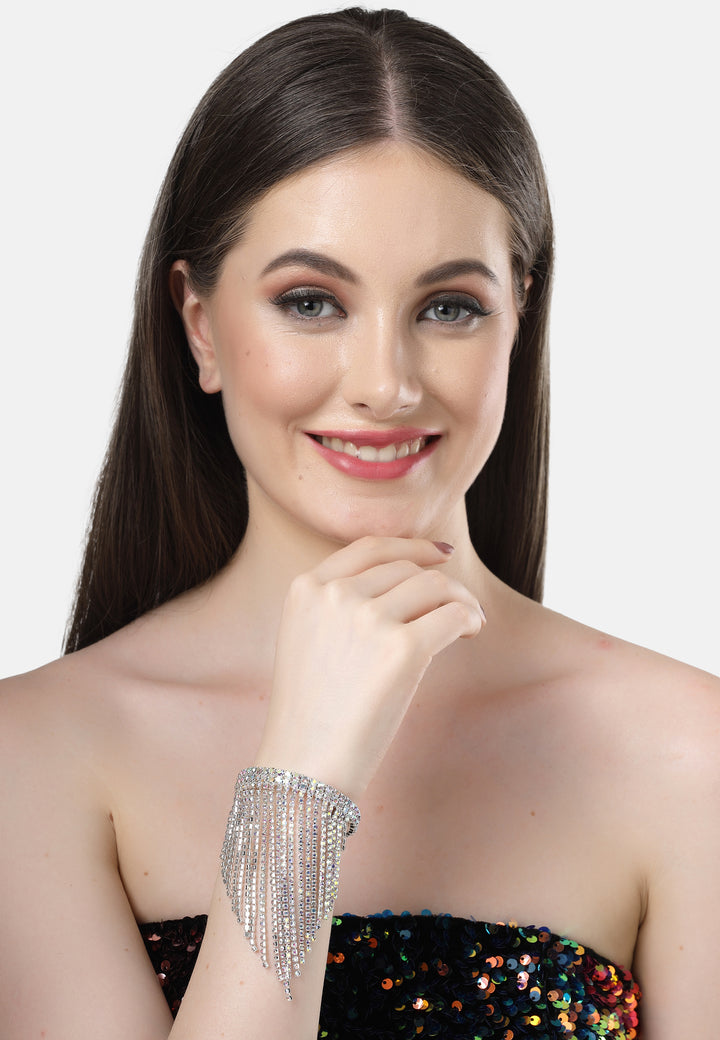 La pulsera con borlas relucientes es un accesorio lujoso y radiante que irradia elegancia y encanto. La cadena pulida añade un toque de sofisticación, creando un contraste sorprendente con las borlas relucientes. Ya sea que se use como una pieza independiente o en capas con otras pulseras para una apariencia más ecléctica, seguramente causará una impresión audaz e inolvidable.